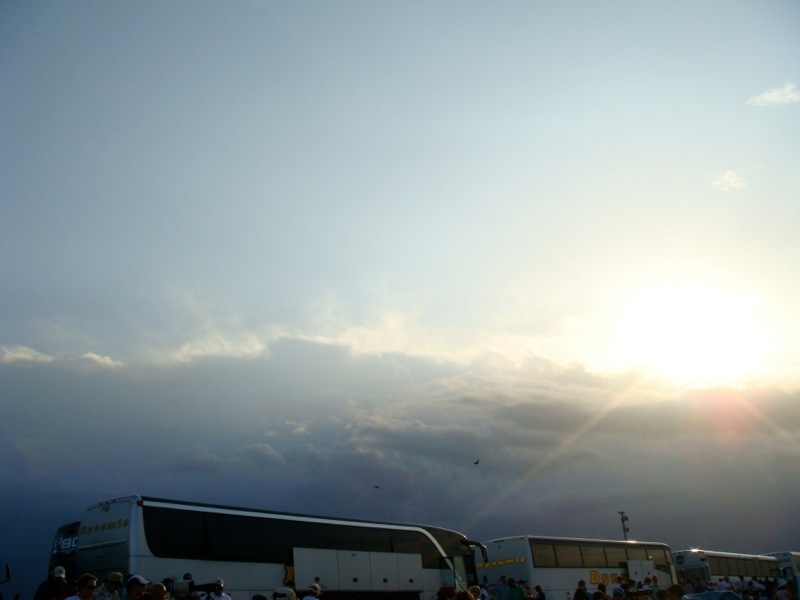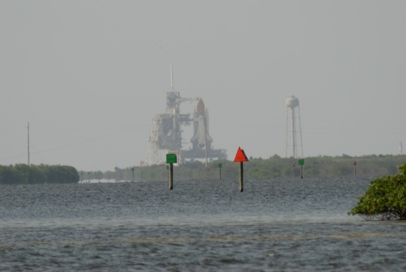 The long wait ended up being well worth it, because I had an even better view than expected. I had a ticket for viewing from the NASA causeway, which is a road across the Indian River, that ranges from about 6.5 to 7.5 miles from the launch pad. This is where I spent the afternoons on the fourth and fifth launch attempts, and it’s not bad. Today however, NASA made the decision to close the causeway to everyone – still don’t know exactly why. So they took us instead to the alternate viewing site located at the Saturn V rocket exhibit. From here, looking across the Banana River, I was only 3.5 miles from the launch pad – the closest anyone is ever allowed. This is where the family members and other VIPs normally view launches. In the twelve years since the Kennedy Space Center Visitor Center has been running the tours and launch viewings, they have never taken a group to this site for launch. What a treat!