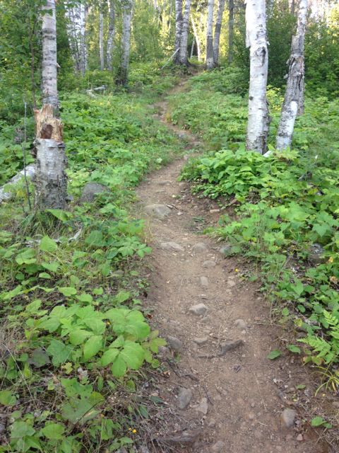 Early in the morning while pushing through a lush overgrown section of the trail, I could hear some sort of activity in the thimbleberry patch on my left.  I suspected a squirrel, but hadn’t spotted it.  Then all of a sudden about 10 feet in front of me a squirrel popped out of the foliage onto the trail and headed straight at me, a second one appeared in hot pursuit. The first squirrel spotted me after covering about half the distance and jumped back into the bush, however the second’s reactions weren’t as quick and he kept coming my direction.  It finally realized what he was up against and came skidding to a halt seemingly right between my boots – like something you’d see in a cartoon, before jumping back into the bush.  I had a good laugh and then continued on my way.