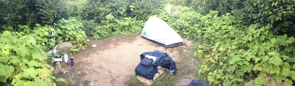 I arrived at the campground around 3:45 and think I got the last free site.  Also, by far the nicest site I’ve had so far.  It was a split level plus had a nice “dining” area with a nice big flat rock for cooking and some well supported logs for seating.  The route down to the lakeside (seen in the page header if you’re on the stand-alone page for this entry) was a nice rock staircase as opposed to the cliff at Lake Desor.  It also had a flat area that you could actually get into the water if you chose to.